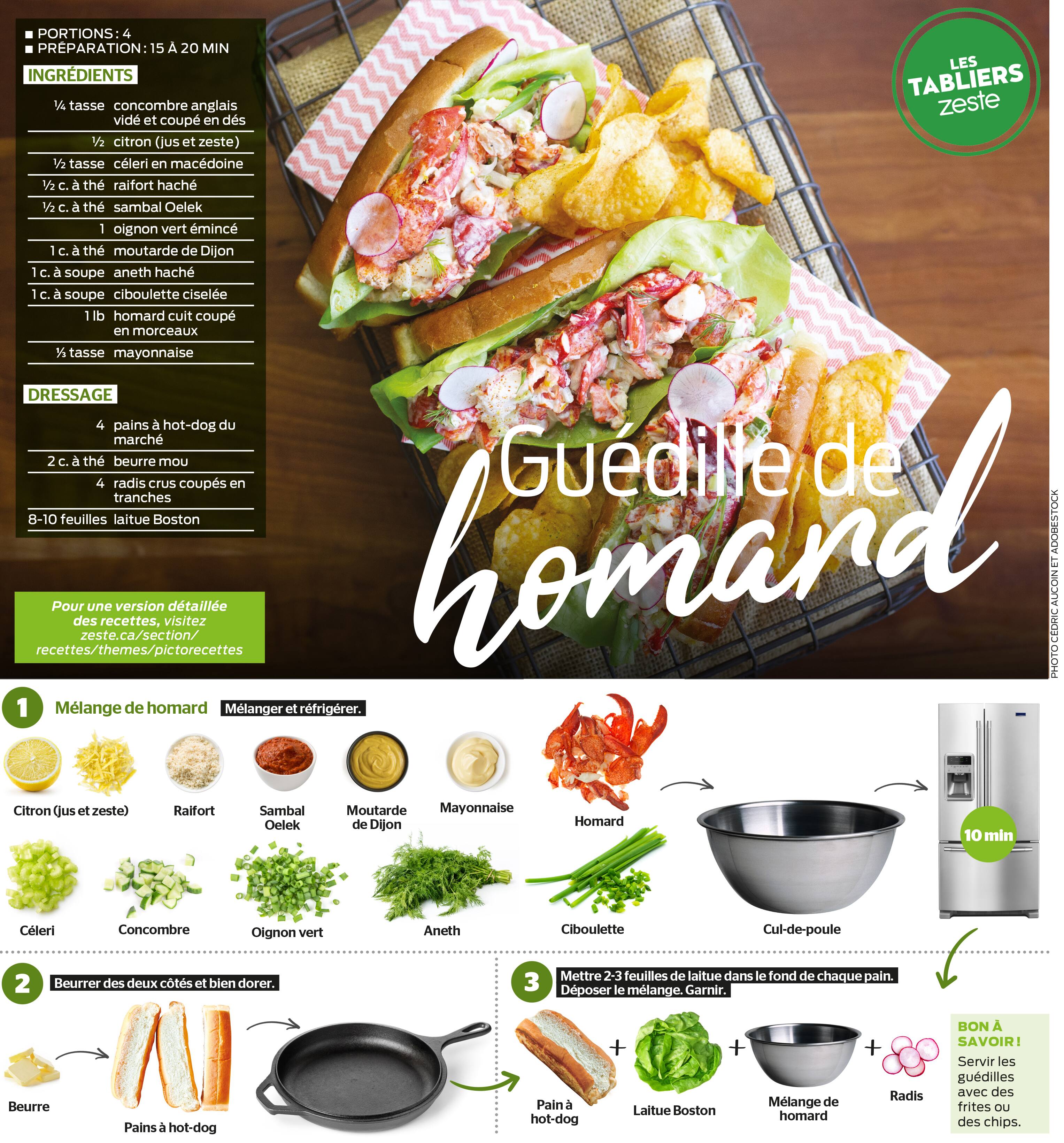 Préparation. Guedilles au homard. Porter 6 litres d'eau salée à ébullition. Y cuire les homards 9 minutes. Égoutter et refroidir. Décortiquer les homards. En récupérer la chair et la.